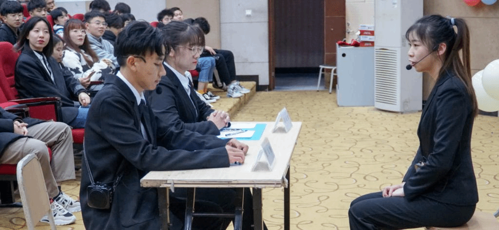 在欢快的音乐声中,面试情景剧缓缓而来,一个一个学生演员风趣幽默,用极其夸张的肢体语言极力表现面试时的啼笑皆非的小故事,一片欢声笑语中我们不仅仅加深了对于求职过程的印象,充分了解求职过程中的忌讳与加分项,同时也为我们的明天修桥铺路,大家都说,以后去面试肯定不会那么紧张和害怕了!在同学们依依不舍的眼神中,情景剧缓缓谢幕,剧情的生动演绎也引发着同学们对面试重要性的思索……