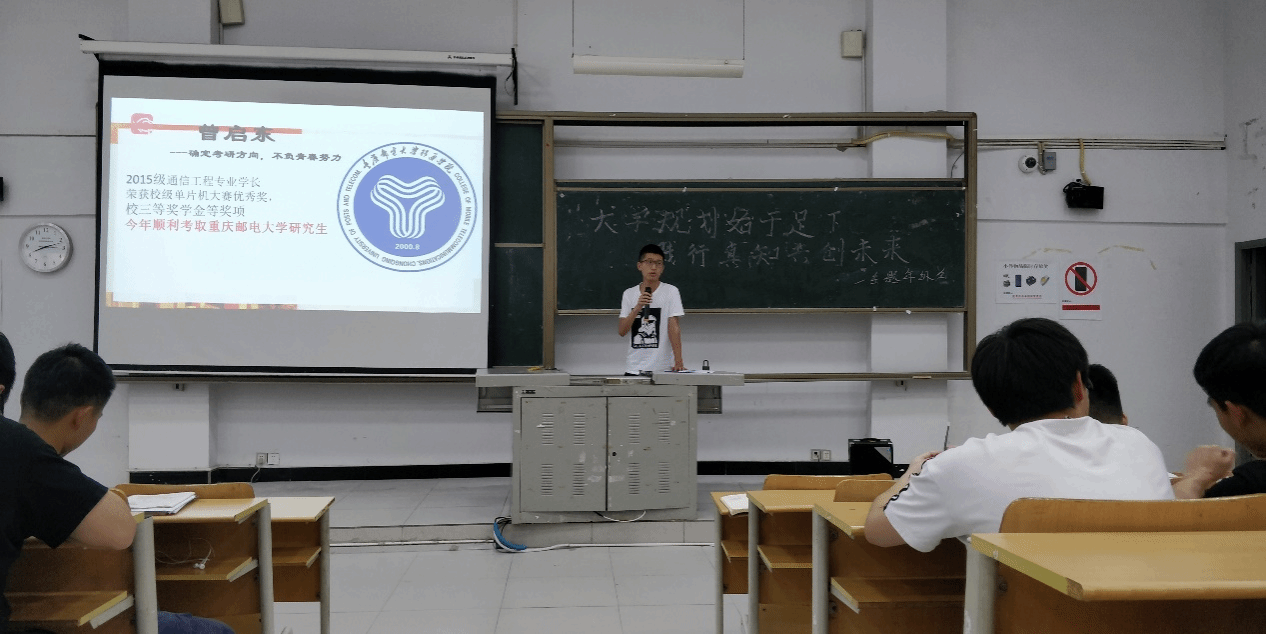 在胡永康学长的讲述后,由两位成功考取上重庆邮电大学研究生的2015级通信工程专业的优秀毕业生——曾启东学长以及2015级电子信息科学与技术专业的优秀毕业生——陈米铃学姐,向在座的各位同学讲述了他们考研路上的所感与所获。他们在关于“考研的学习方法”、“考研的心路历程”、“考研的择校方法”等几个方向,向同学们进行了具体的讲解,用“梅、竹、石”三个事物来传达他们认为考研所需要的“踏实、坚强、主见”三个重要的精神。他们同时也说到他们考研过程中会遇到疲惫的情况,但是无论如何,都只能坚持信念,才可以实现考研成功的目标。