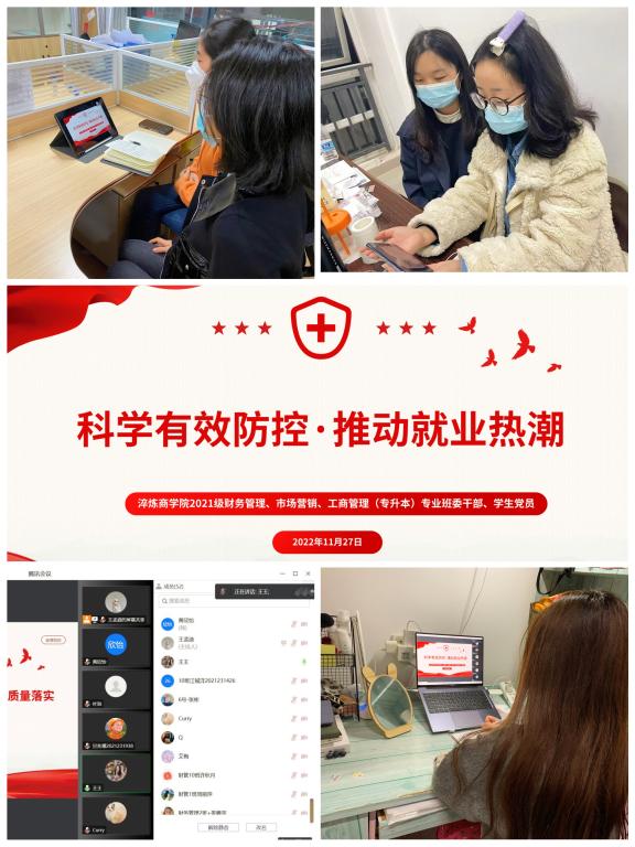 为科学有效做好疫情防控工作,持续巩固校园疫情防控成果,深入推进毕业生相关工作有序开展。淬炼·国际商学院2021级财务管理、工商管理、市场营销(专升本)专业,于2022年11月27日20:00时在腾讯会议开展以“科学有效防控·推动就业热潮”为主题的防疫知识培训暨就业分享会。本次会议聚焦个人日常防护、实习材料提交、就业工作进展等问题,多维发力强化疫情防控与促进就业。本次会议由辅导员王玉勤、叶洵主持,全体班委干部及学生党员参与其中。