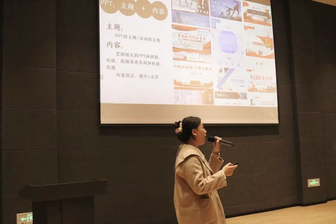 胡纯菲学姐告诉大家“一个合格的PPT最重要的就是‘主题+内容’,扣好主题的同时丰富内容,增加故事性”,“故事性”是胡纯菲学姐强调的重点——“要让你的PPT活起来”。相信双校区的新生班委与学生组织干事能够将胡纯菲学姐所培训的内容,充分运用到日常学习与工作中去,不断提高自身的综合素质,以更积极、更高效的状态投入到各项工作中。