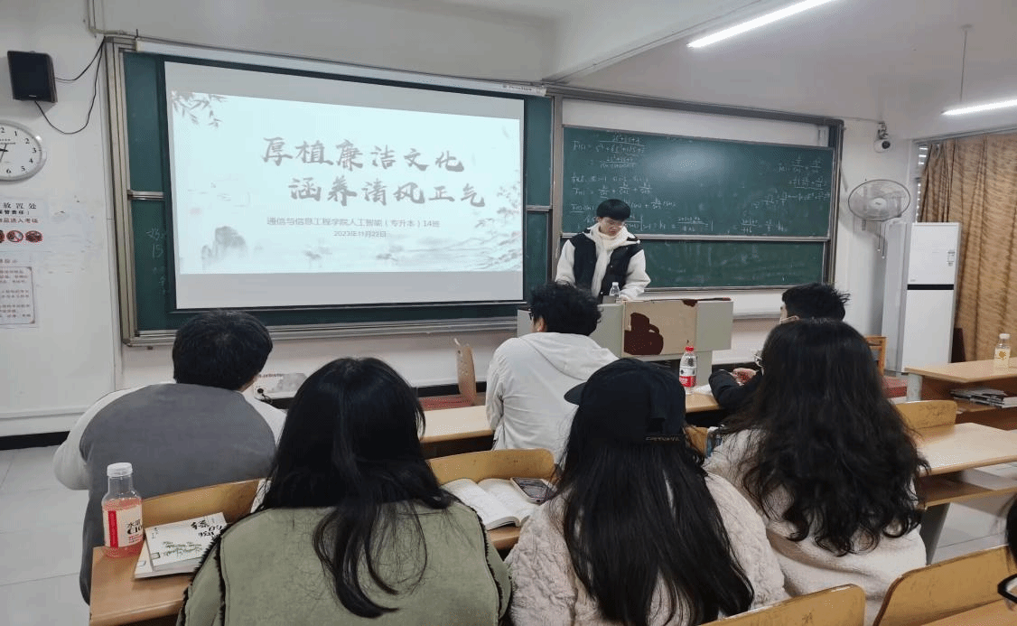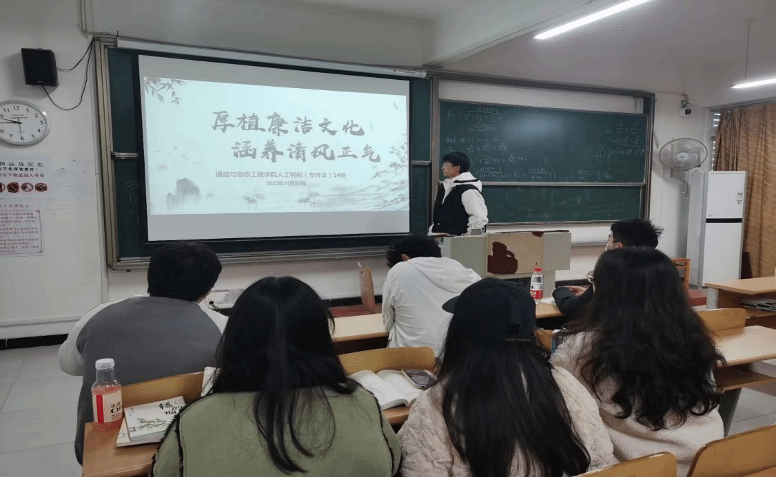 新的一天,新的征程。2023年11月2日在这个充满活力与朝气的校园里,我们人工智能14班迎来了一场别开生面的活动——“厚植廉洁文化,涵养清风正气”。这项活动旨在提升同学们的廉洁意识,弘扬清风正气,共建和谐校园。