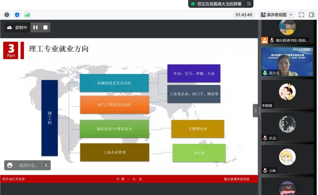 同学们一边听一边通过现场老师在直播评论区提问,所有问题都一一得到了回答。在讲座之后的现场讨论中,大家纷纷表示,这样的职场信息和建议是课堂上学不到的,因此非常有意义。同时,通过高大玉老师的行业分析,也对我院各个专业的未来职业发展充满信心。
