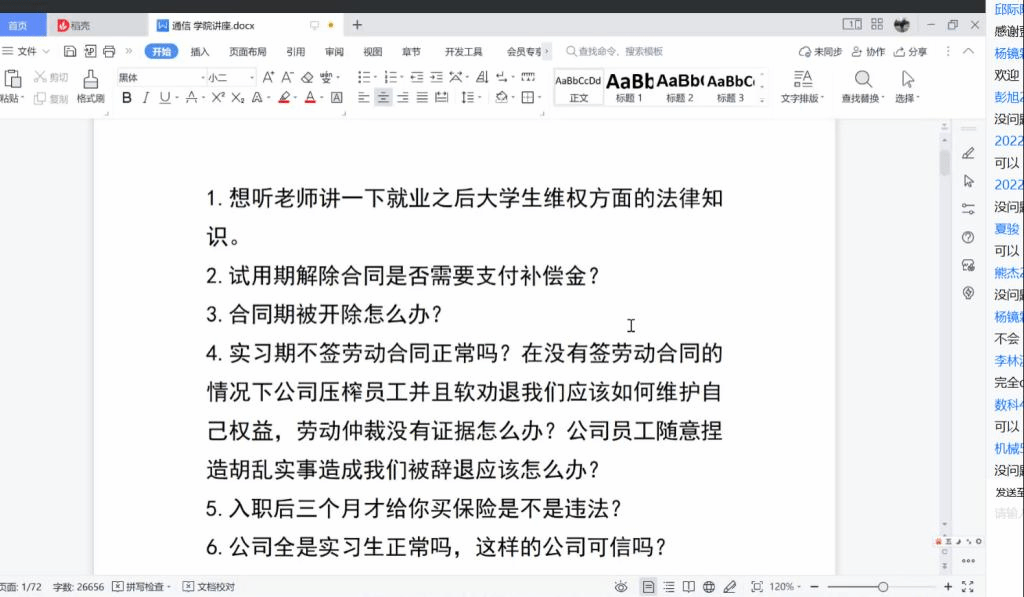通过本次讲座,加强了同学们就业创业中的自我保护意识,学会了如何通过合理且高效的途径维护自己的权益,懂得了如何在未来就业中利用法律知识,给自己未来的就业奠定法律基础。在大环境的影响下一定要学会合理利用劳动保护法为保障我们的就业权益。相信经过此次活动,大家在未来的就业中将一帆风顺。通信与信息工程学院学生会也将持续为同学们的权益保驾护航,如果大家有任何需要法律援助的支持都可在通信与信息工程学院线上线下权益信箱与我们取得联系哦!