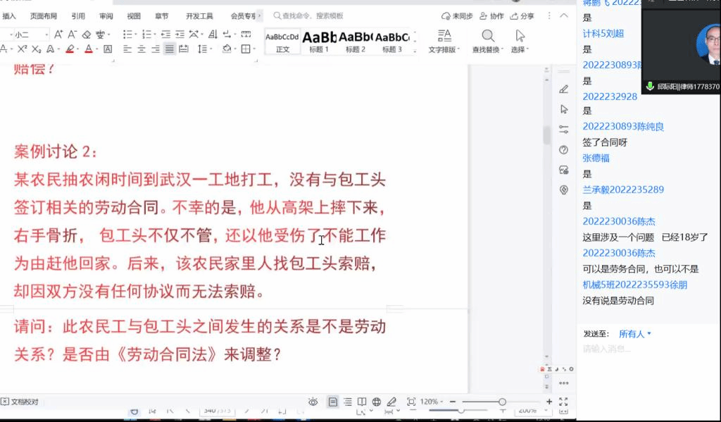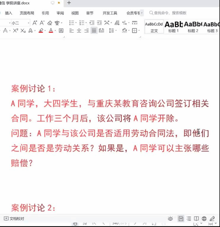 讲座伊始,邱老师通过两个案例讨论引入本次课程,分别是同学们在打暑假工时普遍会遇到的与教育机构的合同问题以及在没有签订劳务合同时的索赔问题。邱老师指出,在工作期间没有出现重大过错时,公司是不能开除员工并且按照劳动合同法不足一年按一个月的工资进行补偿。而案例二中《劳动合同法》则是对弱势群体的一种保护。