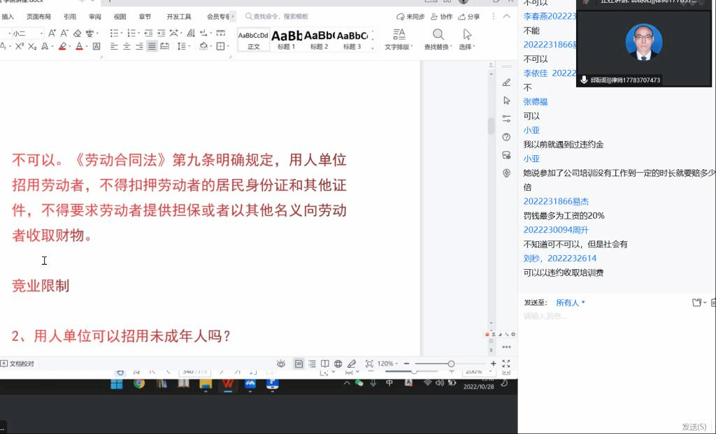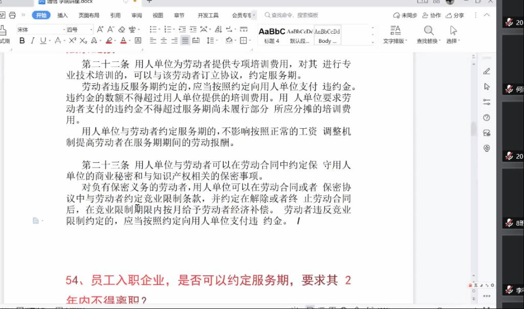 然后邱老师提出了两个关键词,分别是“竞业限制”和“商业秘密”。竞业限制指用人单位和知悉本单位商业秘密或者其他对本单位经营有重大影响的劳动者在终止雇佣合同后的一定期限内不得在同类型或有其他竞争关系的用人单位任职,也不得自己生产与原单位有竞争关系的同类产品或经营同类业务。限制时间由当事人事先约定,但不得超过二年。所以当我们从上任公司离职时公司以此威胁我们,我们亦可利用法律保护自己。