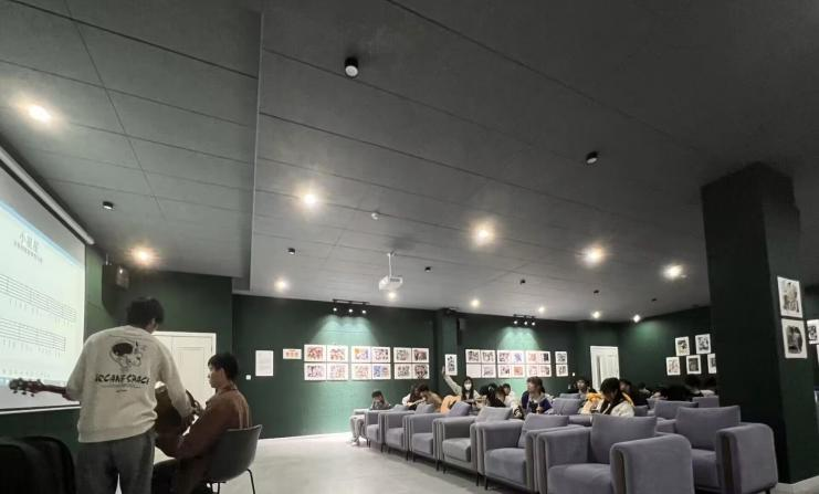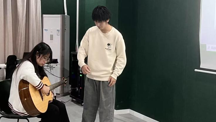 接着小老师就“品”琴弦和摆放姿势对现场学员进行了吉他基础知识的学习。练习中,同学们就在吉他基础学习中遇到的问题,进行了深入的探讨与交流。现场气氛融洽,大家畅所欲言。学员们沉浸在吉他的魅力,殊不知时间已经悄然流逝,同学们从刚开始陌生、别扭逐渐变化为熟稔、热情。在这短短的⼀个小时里,学员们对吉他的感情产生了⼀种巨大的改变。对老师信手拈来歌曲的形象更加崇拜,而艺术的魅力潜移默化地影响着他们的心灵。