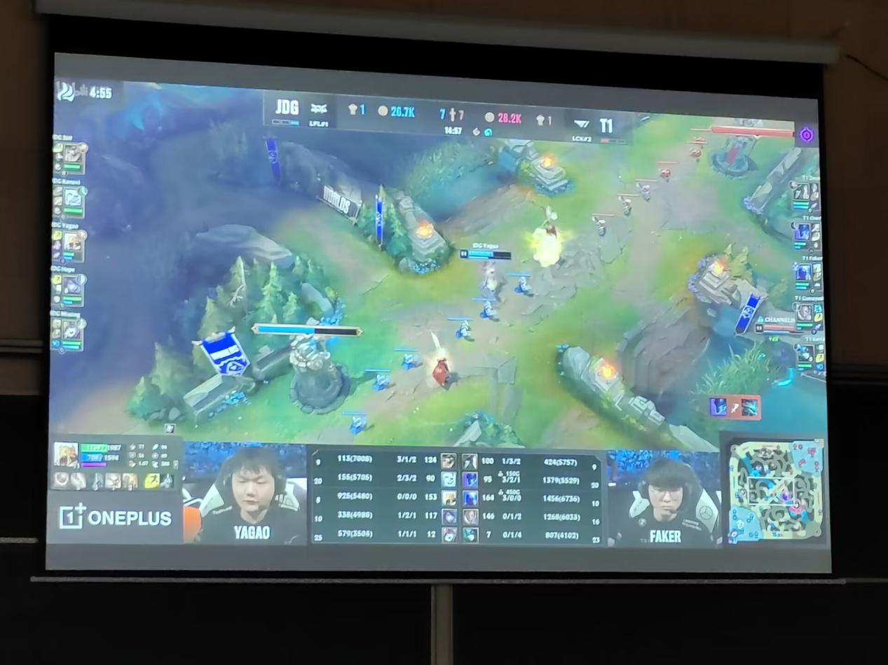 “玉棠见!”是同学们对JDG的期盼,比赛休息间隙同学们纷纷离开温暖的被窝从四面八方汇聚到玉棠书院阶梯教室。第二局JDG与T1打的有来有回,两分钟下路2V2对拼,打出了一波1换1,hope厄斐琉斯拿到了一血,观赛同学发出热烈的欢呼声和掌声,有的同学振臂高呼“nice!”。后期33分钟,JDG在上路抓死了Faker,但是T1其他人赶来团灭JDG后,拿下第二局的胜利。