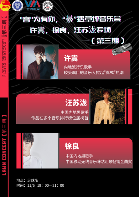为充实封闭式管理期间同学们的大学生活,增进同学之间的感情,拓宽同学们的交际范围,给同学们提供一个展现自我、相互交流的机会,也提供一个舒适轻松的周末。11月6日19:00 star音乐根据地于学校操场草坪举办了“音”为有你, “綦”遇草坪音乐会(第三期)许嵩徐良汪苏泷专场音乐会。