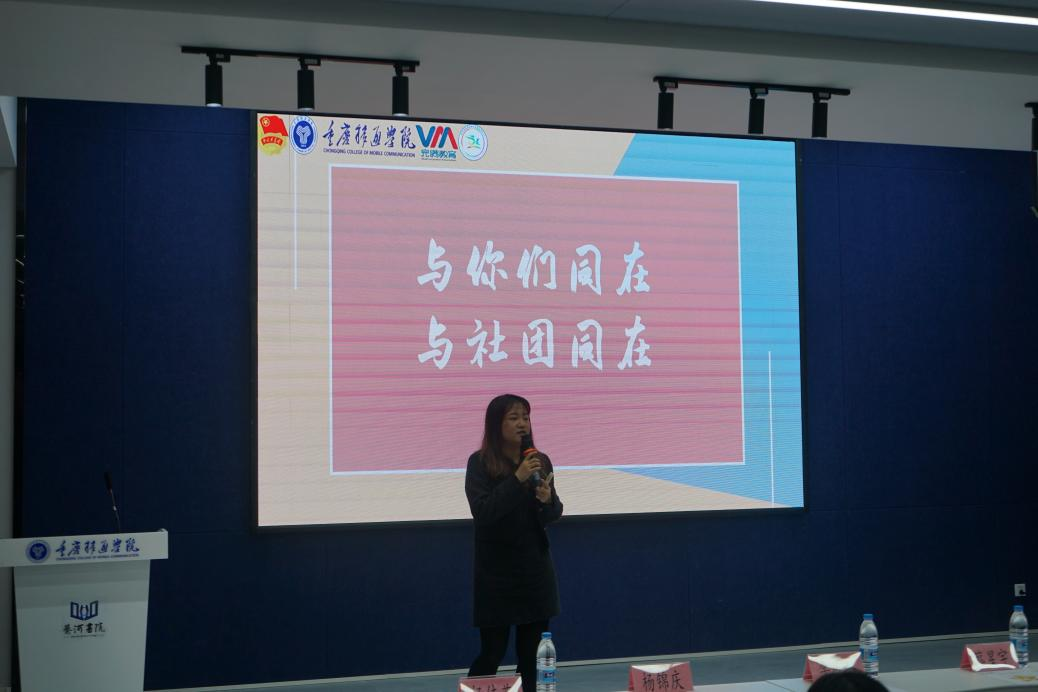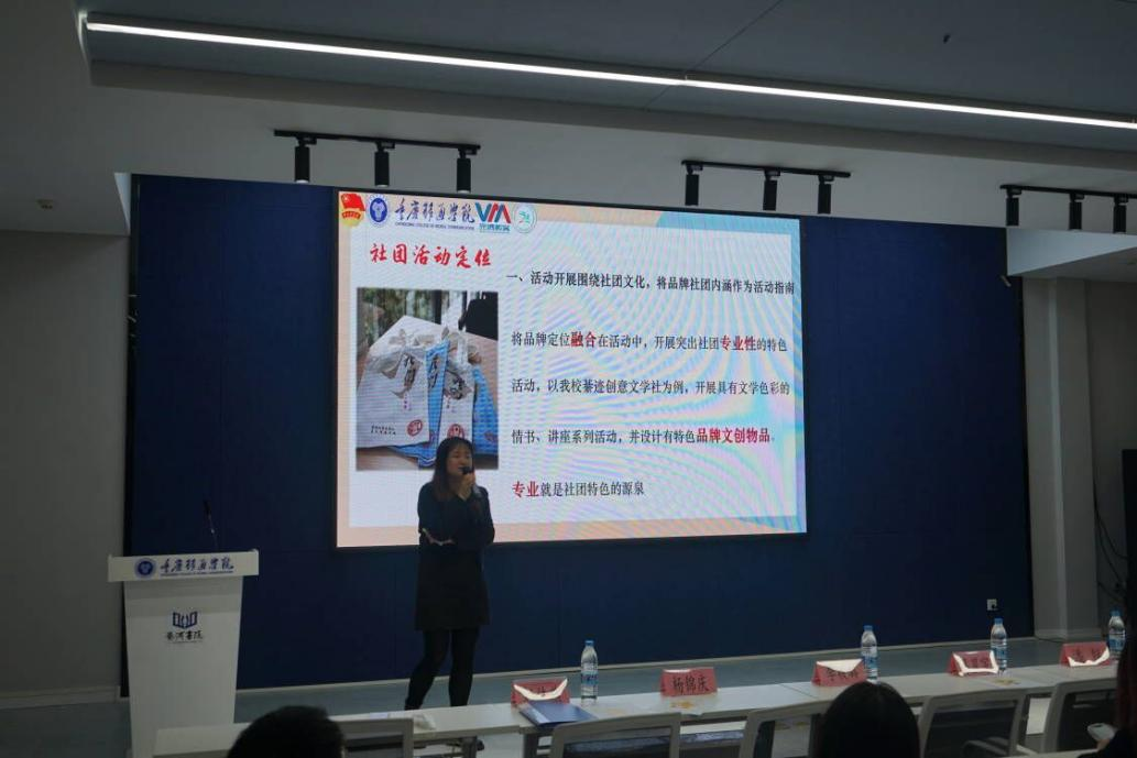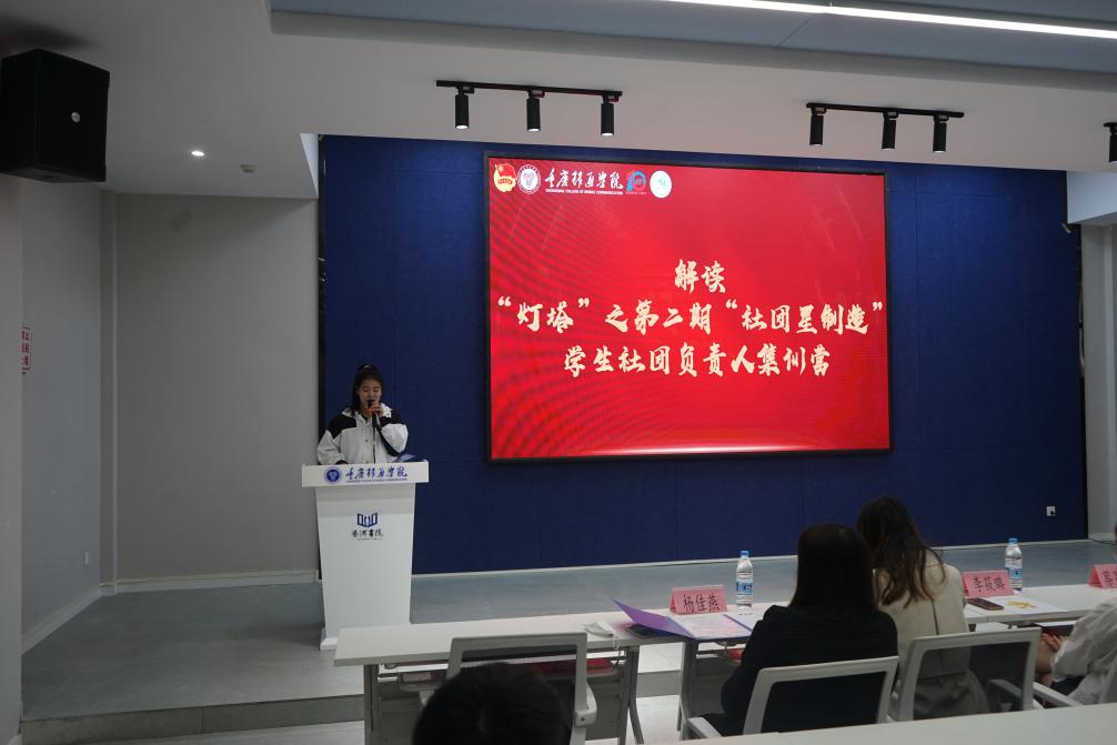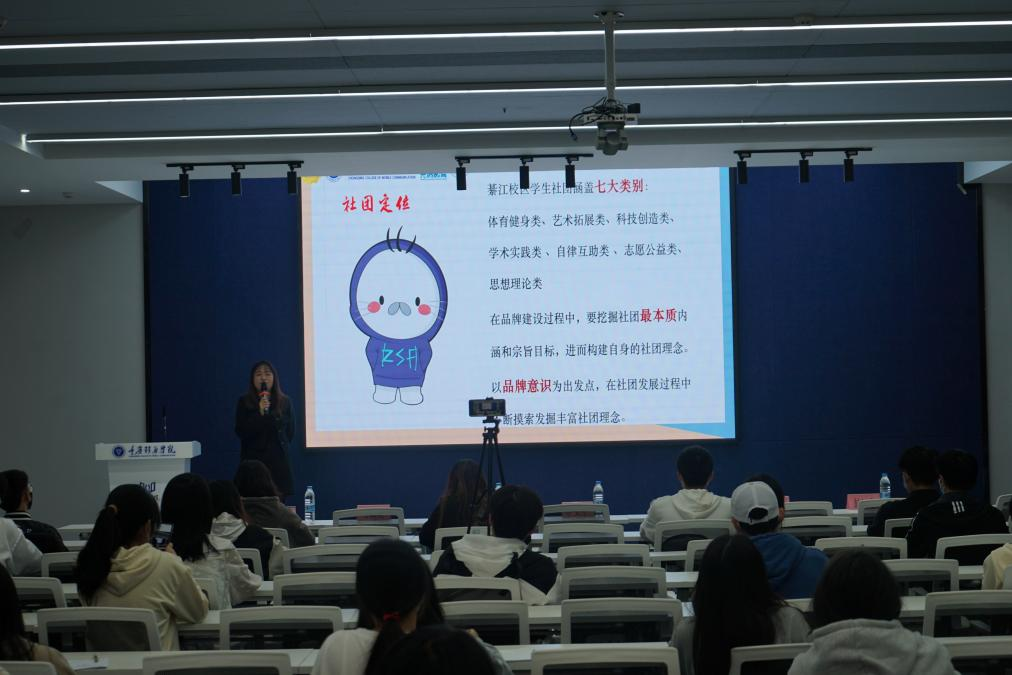 学生社团管理中心工作组代表陈馨怡在现场就“社团星制造”的培养体系、宗旨、培训方式及课程设置作出介绍,并详细解读了培养体系中“2332+”的培养方式,力求用全面与完善的课程体系,在因地制宜的前提下,根据新校区建设实际情况多维度的培养学生社团负责人,使学生社团蓬勃发展,社团精彩全面绽放。此后,社团板块指导老师杨佳燕老师为我们宣读了基础班和进阶班的名单,并对各负责人寄予厚望,希望各位负责人通过在“社团星制造”的培育下,都能有所收获。