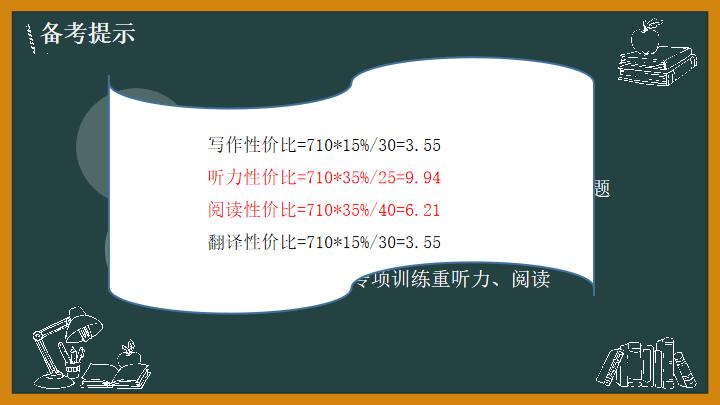 其次,杨芳老师还表示考试答题的顺序很重要,在考场上一定要灵活分配时间,精确掌握每道题的作答时间。听力分值最高所以要尤其注意听力部分,听力结束后就会马上收取答题卡1,所以最好边听边写。关于写作部分,首先要看清是否出现了硬性要求题目,若无就可不写题目,但字数一定要写够。写作时不能翻阅试题册,所以杨芳老师建议同学们可以将翻译答题时间多挪至写作上。