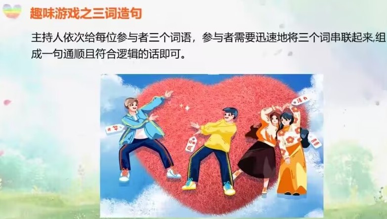 在活动开始之前,女生部邀请到淬炼·国际商学院学工办副院长刘薇唯老师和社团板块指导老师陈思老师为各位青衿蜕变营的学子们进行开营宣讲。刘薇唯院长说道:青衿蜕变营作为淬炼·国际商学院的精品项目之一,其意义是非同一般的,其中所教授的各类课程也是非常具有意义的,希望各位学子能够通过这个机会去收获,去成长,去蜕变。随后,在陈思老师的正式宣布下,第五届青衿蜕变营正式开启了新篇章!活动开始,李梦春老师讲述了团辅的内容和目的,让同学们对团辅活动有了基本的认识与了解。李老师首先组织同学们玩了一个趣味小游戏:三词造句;将同学们一共分为两个组:动物组和水果组;游戏开始,李老师随机抽取一位同学,给他三组词,并在两分钟之内用词造句。这个游戏不仅让同学之间变得更加熟络,同时也锻炼了自身的反应能力。