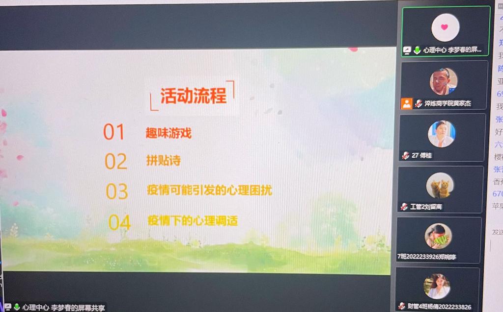 疫情当下,为了配合学校防控疫情工作,同学们开启了封寝生活,在无法外出学习娱乐的情况下,为了给同学们的封寝生活增添色彩,2022年11月15日下午淬炼·国际商学院女生部开展了青衿蜕变营开营仪式暨健康第一讲“疫情下的情绪调节”心理团辅公开课。本次活动邀请了重庆移通学院心理健康教育与咨询中心专职教师李梦春老师主讲,全院百余名同学线上参与。