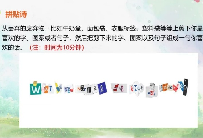 接下来,李老师让同学们选择一句自己喜欢的话,并让同学们在废弃的书籍、报纸或纸箱等物品上剪出自己喜欢的字或单词来拼凑出自己喜欢的话。李老师提供给同学们十分钟,完成好作品的同学们将作品照片发在公屏上,李老师随机抽取了几位同学来解释自己会选择这句话的原因。