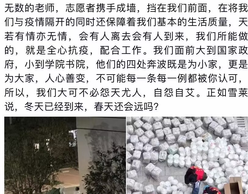 文字递情,文章载意。疫情之下,众生百态。我们有焦虑、有恐惧;有热情、有激情;有挺身而出的勇气、有只手擎天的魄力。为此我在书院读大学通讯社开展了线上寄语分享,同学们用文字治愈心灵,让生活阳光明媚;为志愿者助力,做他们最坚实的后盾。