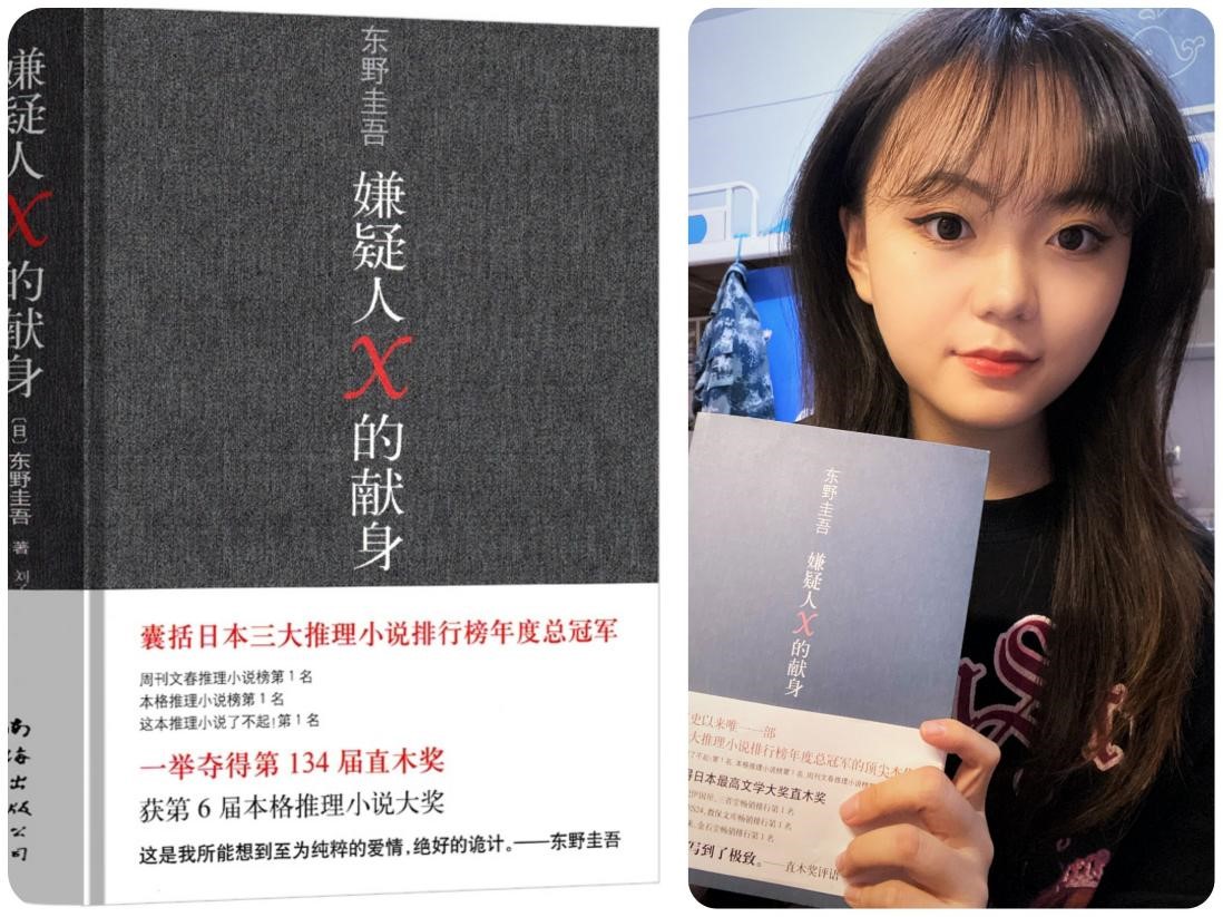 外国语学院2022级英语专业的张霖同学和大家一起读了《嫌疑人x献身》,在她的介绍下,我们走入了深邃迷离的推理世界,不易猜透的悬念、深埋于心的爱意,人性、法律与情理的矛盾,边缘人群的悲惨生活,都揭露了这个社会有着阳光照耀不到的角落。张霖同学说:“分享是快乐的,分享书籍能让我们了解不一样的内心世界,通过参与这个活动,能更好地在疫情期间进行线上阅读交流,保持阅读分享的习惯。”