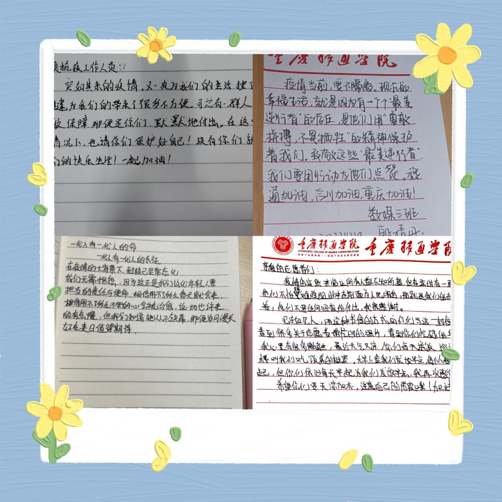 在本次活动共收到230余份手写“情书”,艺术传媒学院的同学们伏案笔耕,在白纸上表达出浓厚的情感,诉说着无限的爱意。他们用书信表达对她的亲切问候,他们用笔为全校师生筑下坚实的精神堡垒,一起用爱掌舵向彼岸起航。