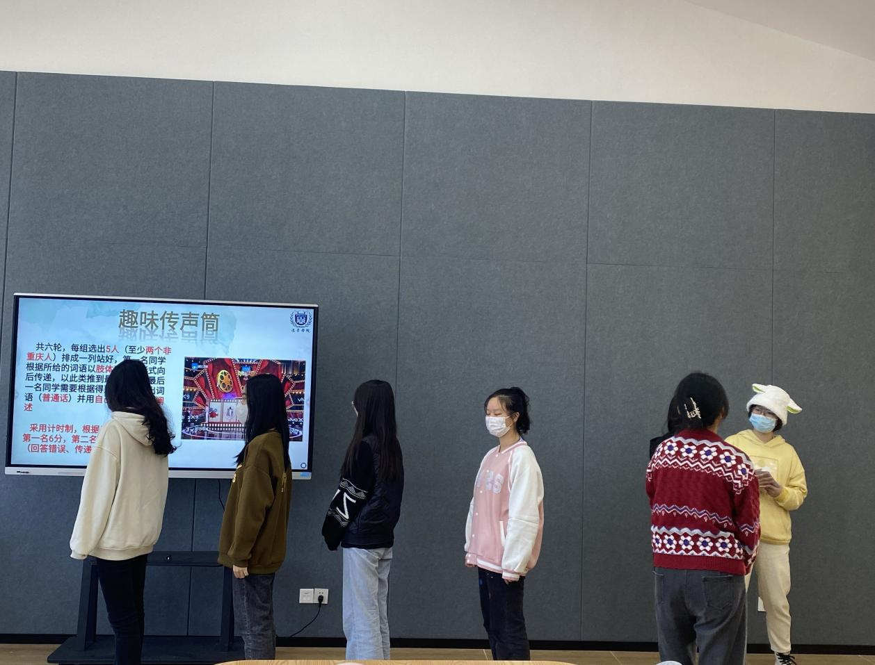 趣味传声,你做我猜。各小组成员绞尽脑汁,使尽浑身解数用肢体向队友传达着他们所看见的重庆方言,是“秒懂”还是“大大的疑惑”,同学们的表情和肢体动作已淋漓尽致的展现。“击鼓传花”环节,花落谁家,谁便上台为大家表演一个与自己家乡相关的节目,并借此来传播多元的、多彩的地域文化,分享中也彰显了同学们对于自己家乡文化的自信。