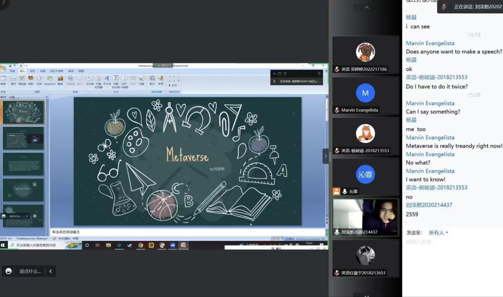 作为一名资深的游戏玩家,刘泽熙同学分享了自己准备的关于元宇宙(Metaverse)的全英文的PPT。他向同学和老师详实、生动、有趣地介绍了元宇宙的起源、发展、重点产品以及前景。整个过程中,刘同学展示出轻松自如、知识渊博的一面。