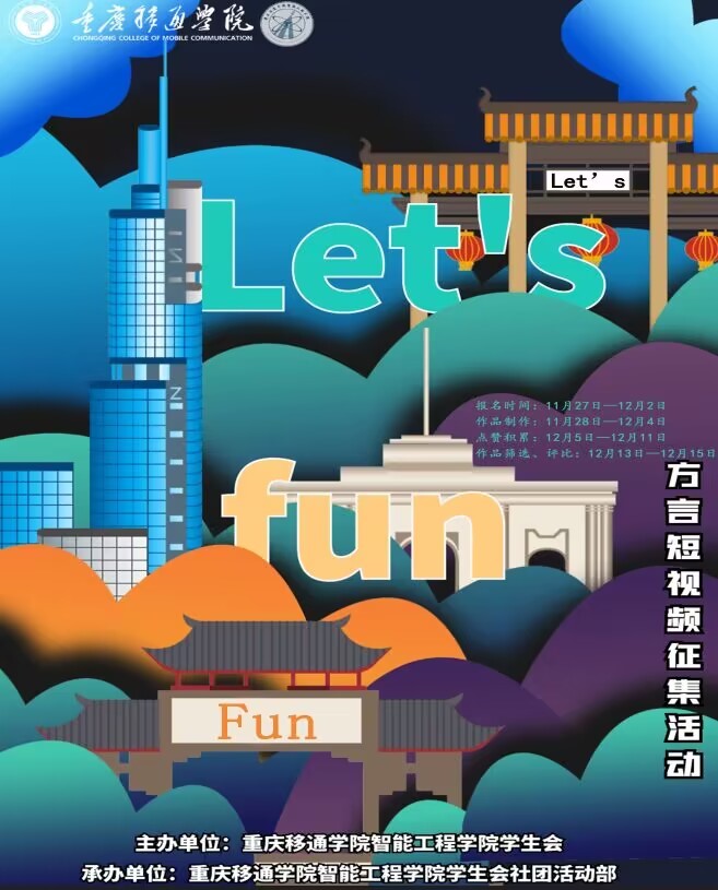 方言是我们每个人记忆力最温暖的家乡回忆,为了让同学们感受家乡的文化特色,提高同学们的表达能力,在11月~12月,因疫情原因,智能工程学院社团活动部在线上举办了let’s fun”方言创意创意短视频征集活动。本次活动的同学们来自艺术传媒学院、外国语学院、智能工程学院、远景学院以及其他学院,参与报名达126人,并有5份作品获得奖项。