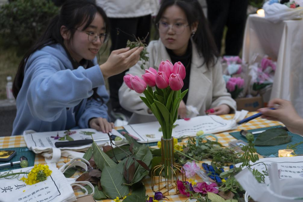 一束花的仪式感永远不会过时,手工DIY的郁金香、樱花钩织摊位面前围满的人,收获的是成功GET创作品的满满成就感。春天到来,樱花初绽,在国潮动漫的记忆中,樱花的季节便是浪漫唯美,二次元的世界也充满了爱与自由。动漫社同学们的COS更使得本集市增添一丝活泼。在春天一起去吃限定樱花酥,美食让人治愈,在集市中空气也增添了一份香甜,同学们精心制作的樱花酥,无论品相还是味道都为上佳,也为同学们带来快乐与美好。在杂货铺摊位里,同学们用自己的双手创造一个又一个美丽的事物,“保持对生活的热忱与爱,每一天都过得热气腾腾”!