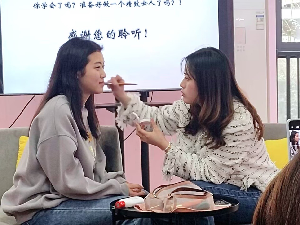 在互动环节中气氛活跃,大家积极向老师请教,吴丽玉老师热情分享自己的经验,并强调皮肤护理在化妆过程中至关重要,了解同学们的皮肤肤质,并向同学们推荐合适的洁面产品,点明化妆产品不一定要追求奢侈的高价格,适合自己的才是最好的。特此,吴丽玉老师贴心地向大家推荐相关护肤、美妆博主供同学们有效学习。同学们在老师的细心讲解下收获颇多。