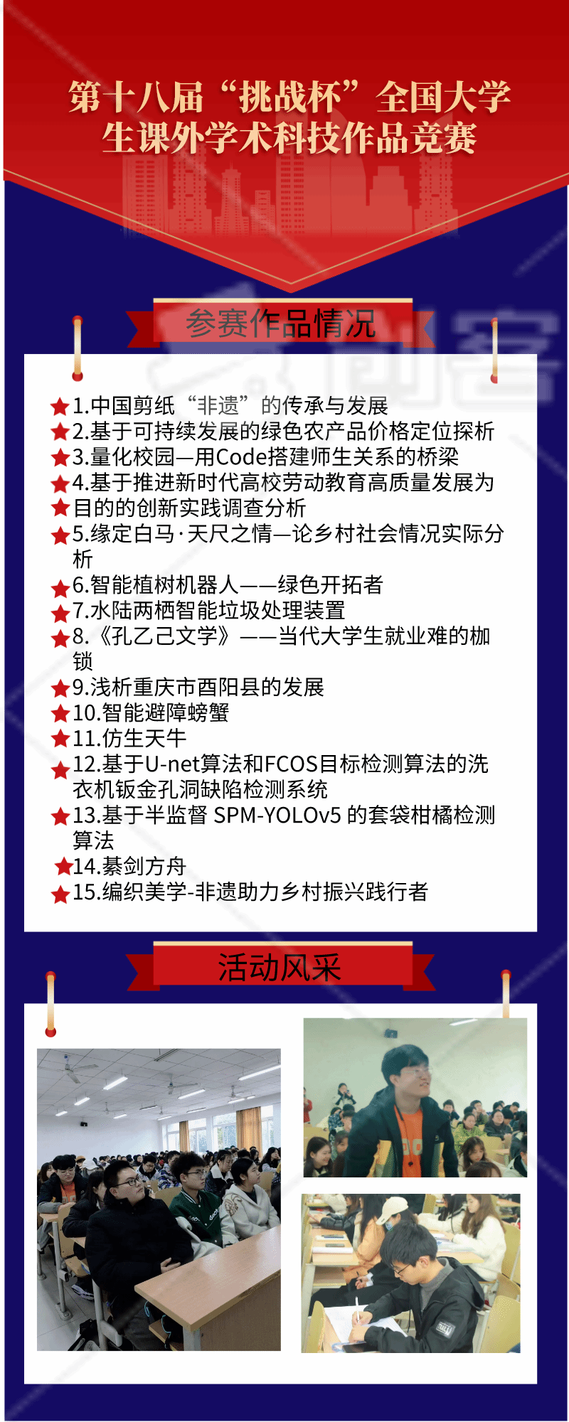 科技是第一生产力、人才是第一资源、创新是第一动力。学校本次第十八届“挑战杯”选拔赛的圆满举行,激发了广大学子的创新意识、创造思维、科技能力和学术精神。期待广大青年在奋进中激荡青春,在挑战中放飞梦想,为社会经济高质量发展创造新优势、打造新动能,为谱写新时代中国特色社会主义更加绚丽的华章贡献青春力量!