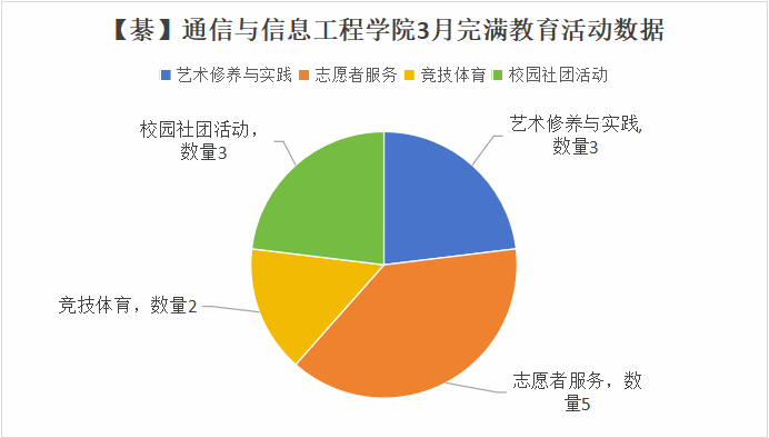 通信过程与信息工程学院完满教育APP管理小组对本院三月的完满教育数据进行统计和分析,通信与信息工程学院(綦江校区)三月份共推13场完满教育特色活动,其中校园社团活3场,艺术修养与实践3场,志愿者服务5场,竞技体2场,覆盖人数为2731人。