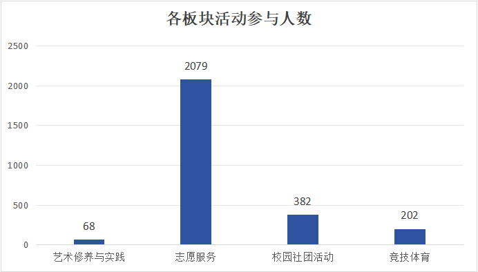 从三月的活动数据可观察出,本月的完满教育活动中,志愿服务活动板块参与人数最高,共2079人,艺术修养与实践活动板块参与人数最少,共68人。