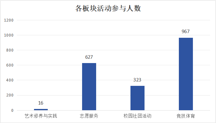 从三月的活动数据可观察出,本月的完满教育活动中,竞技体育活动板块参与人数最高,共967人,艺术修养与实践活动板块参与人数最少,共16人。