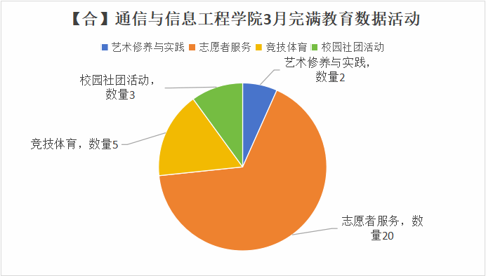 通信过程与信息工程学院完满教育APP管理小组对本院三月的完满教育数据进行统计和分析,通信与信息工程学院(合川校区)三月份共推30场完满教育特色活动,其中校园社团活动3场,艺术修养与实践2场,志愿者服务20场,竞技体育5场,覆盖人数为1933人。