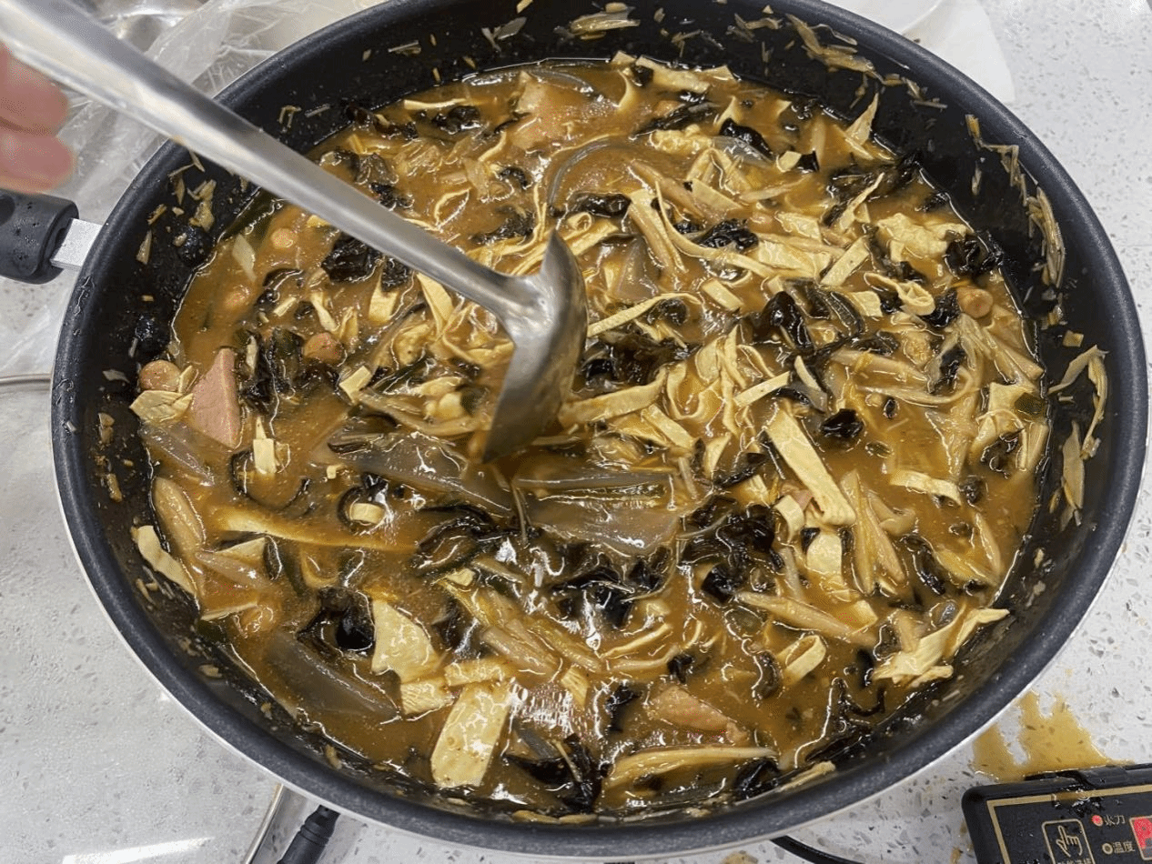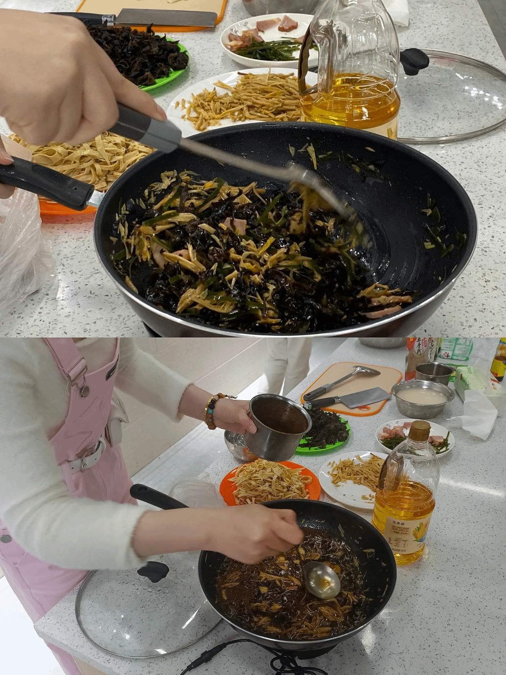 在小老师的指导下,同学们相互配合分工,对食材进行初加工。有的对面筋进行柔洗,有的在准备调味品和配菜,默契的合作使得制作过程十分流畅。在场外观摩的同学也仍不住跃跃欲试,笨拙的模仿着柔洗姿势。在小老师的指导下和团队之间的默契合作下,同学们很快就品尝到自己的劳动成果。
