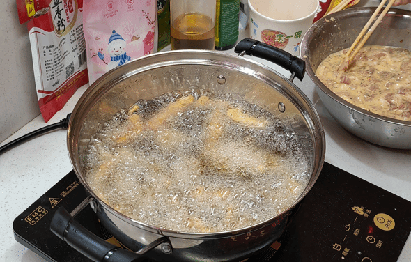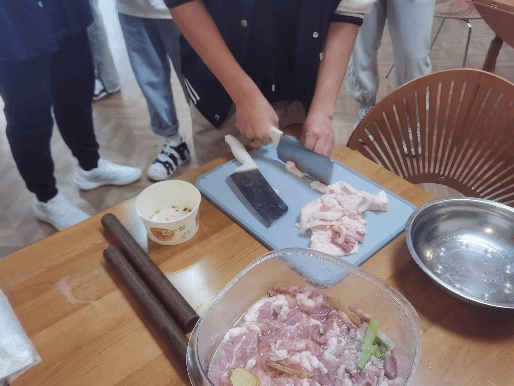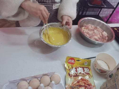 炸小酥肉一,讲究入口酥脆,二,讲究肥肉入口即化,油而不腻,满嘴飘香。想要满足这两个条件可不容易,从选材方面都是有讲究的。同学们在小老师的指导下将五花肉切成长条,保证每一根肉条都有肥有瘦,另一位同学也不闲着,开始调制小酥肉的灵魂——蛋糊。蛋糊是制作小酥肉的关键,调出合格的蛋糊才能有酥脆的口感。两位同学们默契分工。在将酥肉放入油锅里炸的数分间,烘焙坊已然飘香。小酥肉拥有了非常酥脆的口感,拿上一块放入嘴中,牙齿和酥肉的碰撞下发出“咔咔咔”的响声,响声伴随着浓浓的香气在嘴里绽放,葱姜蒜的加入使得酥肉的香气越发浓郁,给酥肉赋予更加完美独特的味道,同时也拨动着人们的味蕾。