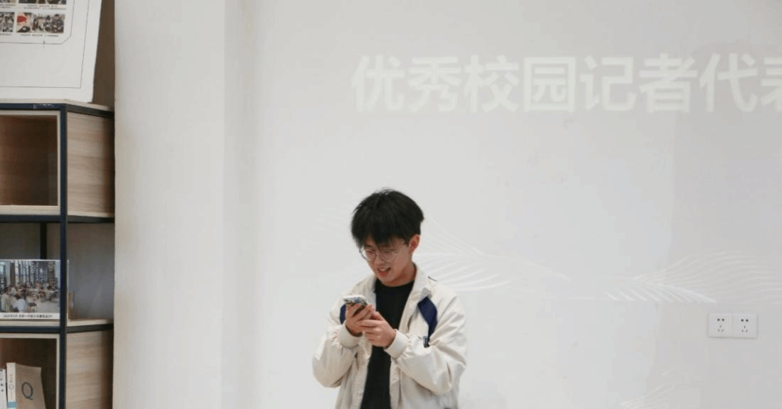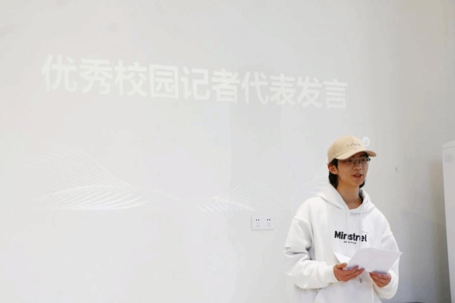 首位优秀记者代表发言人彭宁奇上台进行发言,他在发言中说到他这两年来的收获“在这接近两年的时间里,我学会公众号运营的一些基础技能,学会了如何去写好一篇新闻稿,学会如何去采访,学会了如何去管理、统筹部门事务,学会如何去做一篇推文等等,当然最大的收获我认为是能够与在座的诸位同学、老师们相识,我觉得这是最幸运的一件事。曾经我幻想过我的大学生活,是在寝室里暗无天地的玩四年游戏,还是当个老实人好好学习,最让我意想不到的是,是部门的人老师、同学们成为了我大学生活中最精彩的一笔,让我有事干、有钱赚,有时愁眉苦脸,但更多的时候是每天开心笑”
