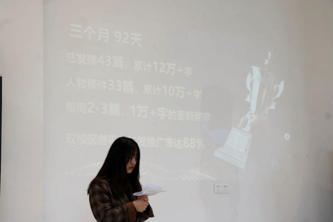 活动伊始,江铭宇老师向大家讲述“我在书院读大学”栏目的创办之初和至今为止的高光时刻和社团成绩。“我在书院读大学”栏目在短短的三个月,92天的时间里,总共发稿43篇,累计12万+的字数。而人物稿件则有33篇。每周以2至3篇的更新频率更新,且在双校区各平台的推广率达到88%。此外,江铭宇老师还从三个方面汇报了2022年“我在书院读大学”项目的具体情况。