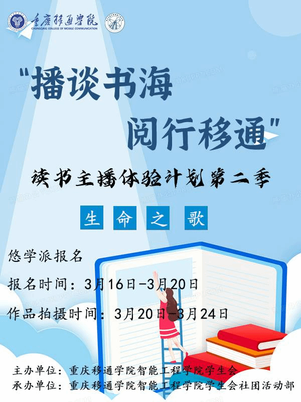 书籍是许多烦恼的解药,是知识的源头,是人类的精神食粮。为了让同学们不负春日好时光,体验阅读的乐趣,品百种书籍,悟生命之歌。2023年3月16日-4月2日智能工程学院社团活动部开展了“播谈书海,阅行移通”读书主播体验计划活动第二季第二期,本期主题为生命之歌。本次活动参与报名总人数达59人,外国语学院、艺术传媒学院、智能工程学院等学院的同学们都参与了本次活动。本期活动共有3份作品获奖。