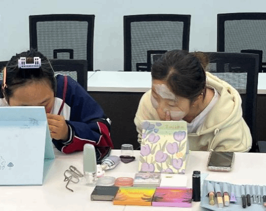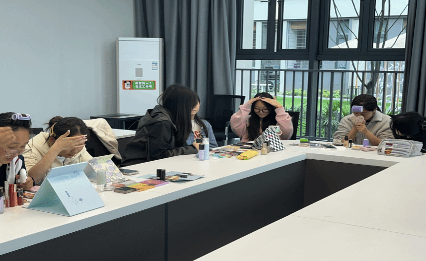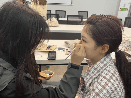 经验分享完后,同学们跃跃欲试地拿起工具,开始上手给自己或伙伴化妆。不会化妆的同学,在伙伴的细心指导下也开始行动起来。而会化妆的同学则与周围的同学交流分享自己的化妆风格。同学们分享安利彼此质地好用的粉底液、好看的眼影盘、实用的口红色号。