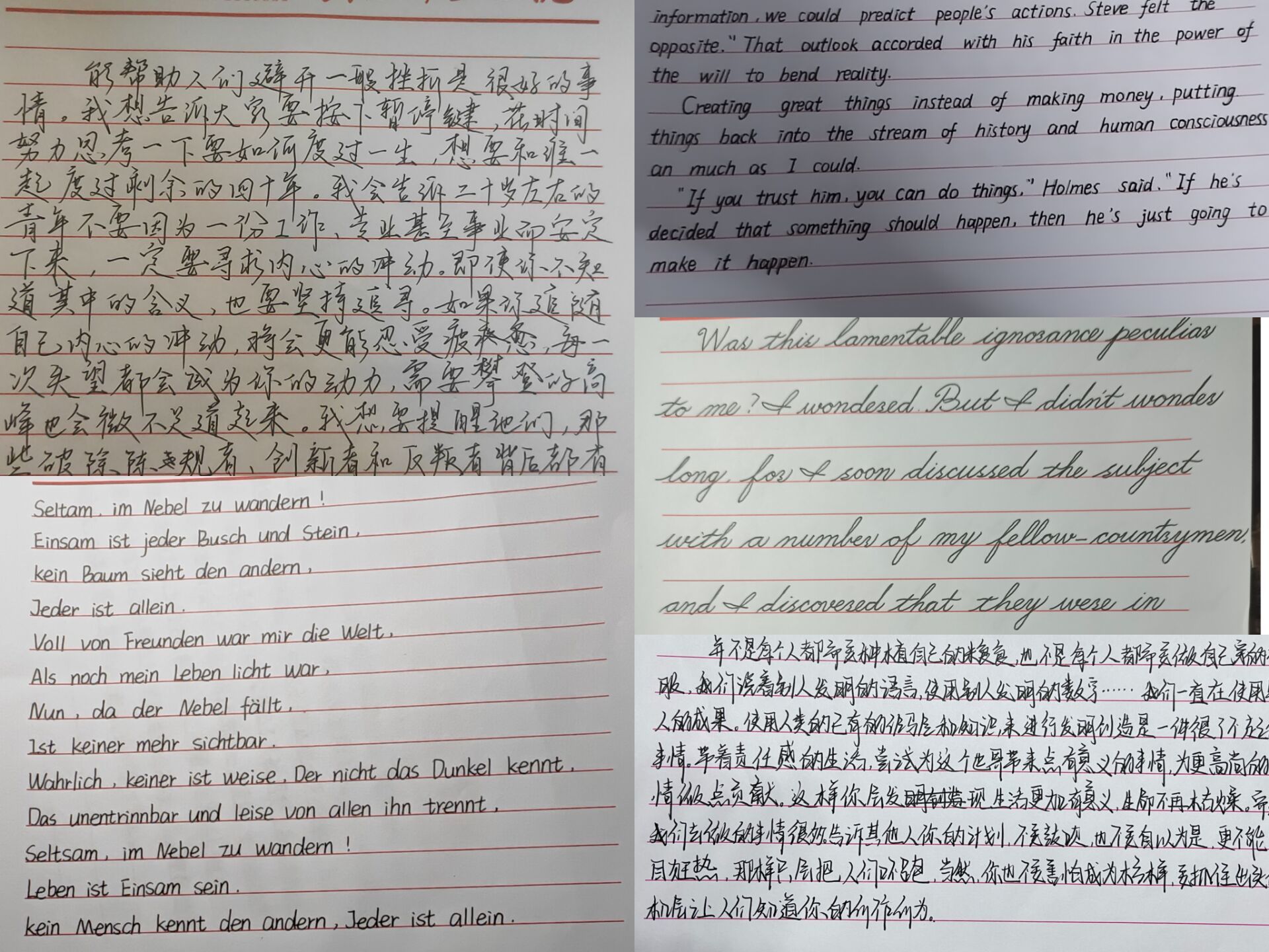 潜心积累,韬光养晦,此之谓深藏不露。初赛开展以来,络绎不绝的投稿无不体现了同学们对书法的热爱和憧憬。当这些字画被整整齐齐地排列在文件夹里,如居高山赏四下之美景,一切尽收眼底。形式各异,风格迥然的作品,将书法的魅力在纸笔上演绎得淋漓尽致,悠韵的墨香仿佛突破了宣纸的限制,洋溢在校园里。