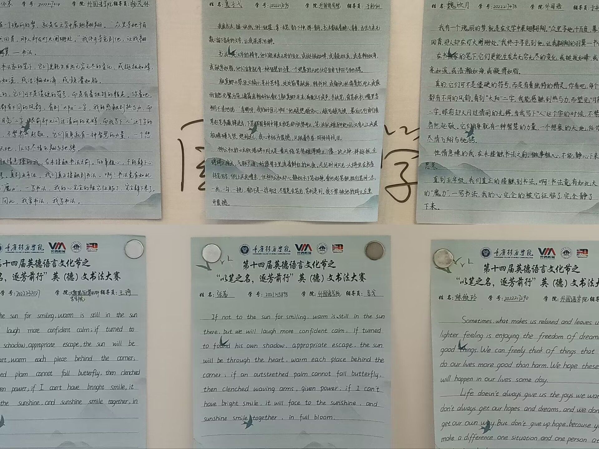 书法是中国传统文化的重要组成部分,是一种极具文化内涵的艺术形式,同时也是连接人们精神世界的桥梁。书法作品不仅能够传达字墨之间的文化内涵,更能够唤起人们的思绪和对书法的赞叹。为了丰富我校同学的课余生活,促进学校书法爱好者之间的交流,增进对书法的了解,使书法文化能够得到更好的传承和发扬,外国语学院学生会学习部与书法美术协会于4月11日12:30于天渠阅览室举行“以笔之名,逐芳前行”英德文书法大赛决赛,还与外国语学院青年志愿者协会蒲公英课堂支队联动融合,在4月15日14点将英德语言文化节与书法大赛带进社区。