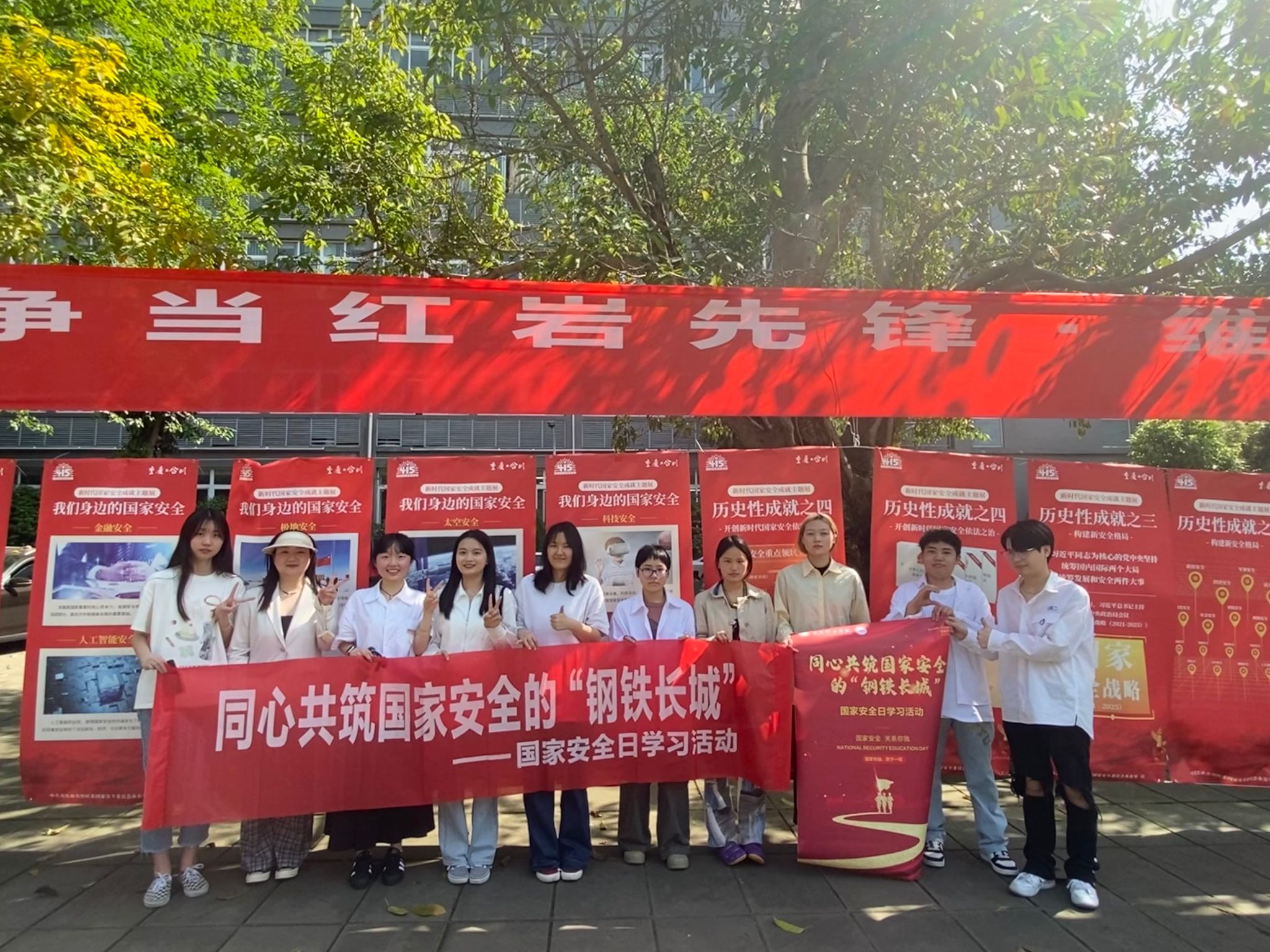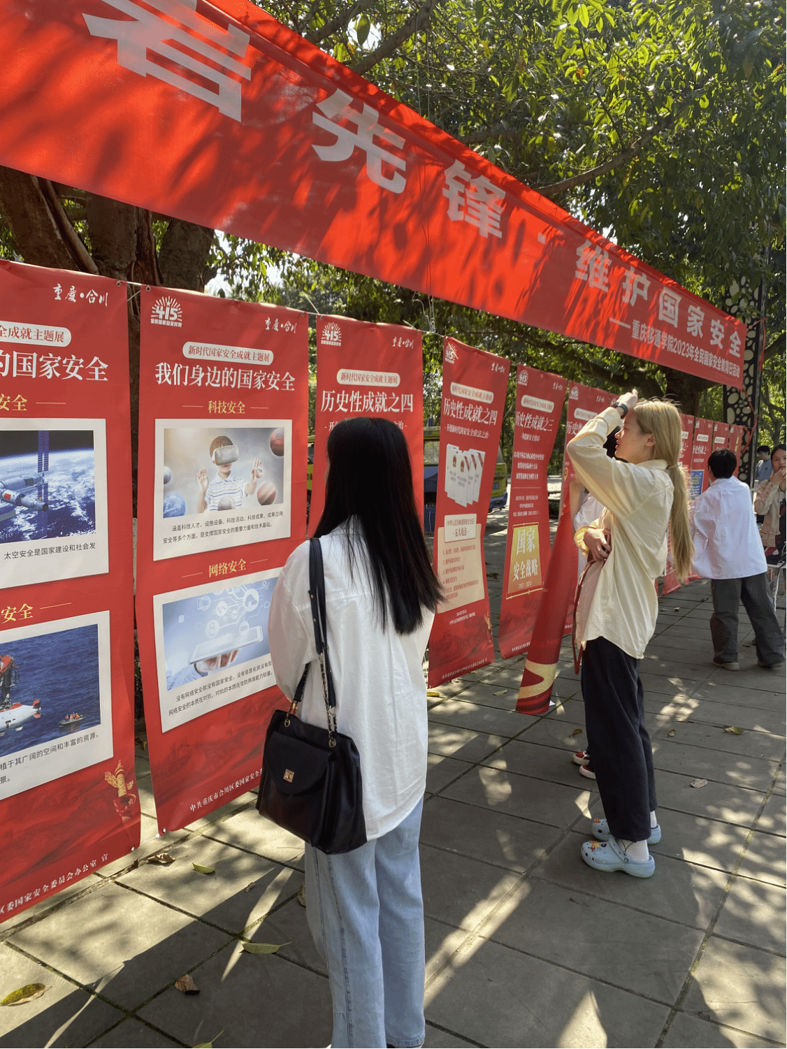 在学校的组织下,黄桷树广场设置了横幅和展板。展板上列出了我们的政治安全、太空安全、科技安全、深海安全等众多方面的安全,无一不体现出保证安全的前提是持党的绝对领导,确保国家安全工作牢牢掌握在以习近平同志为核心的党中央手里。
