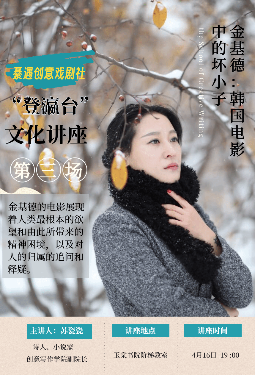 天气热起来了,而玉棠书院的阶梯教室,人气更热。一百多位同学走出门前炎日里,偷闲一刻是乘凉。4月16日晚上19:00点,綦遇创意戏剧社“登瀛台”第三期文化讲座在玉堂阶梯教室拉开大幕,本次讲座特邀创意写作学院副院长、小说家苏瓷瓷老师讲述韩国导演金基德的电影作品。在长达两小时的讲解中,气氛热烈,互动话题不断。