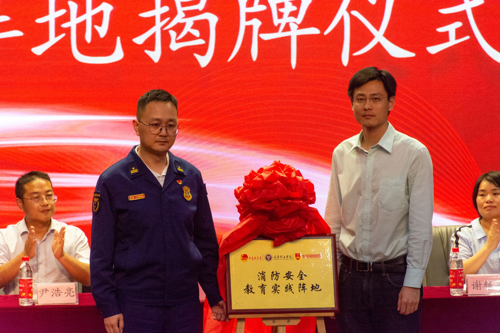 校党委副书记、副校长周伟与合川区消防救援支队黄天来共同揭牌。