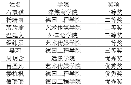 本次活动的评委有德国工程学院辅导员肖瑶老师、李嘉欣老师、艺术传媒学院指导老师孟易老师、许静老师。4月中旬,经主办方初选通过了20个作品,进行了为期2天的线上投票,线下评委老师公正地评审打分后,最终评比出10名获奖者。
