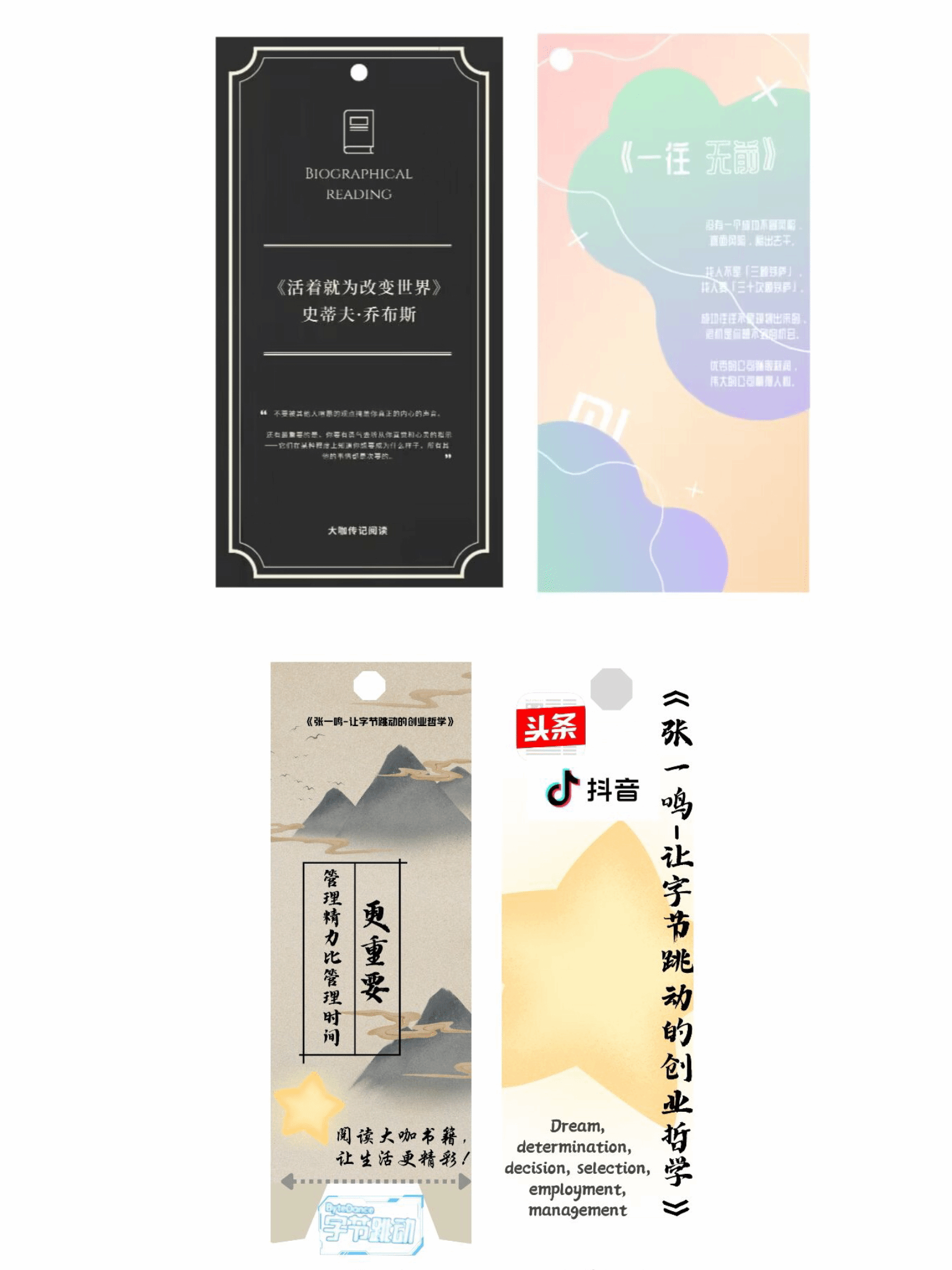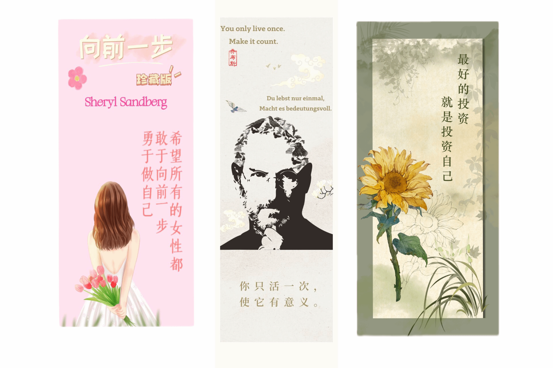 一千个读者心中有一千个哈姆雷特,一枚小小的书签,深含着的是作者对于大咖传记的独特思考。将抽象的思考化作了浅显的书签,用绚丽色彩、名人名言构筑出了一个个多彩的思考世界。就让小德带领大家再次欣赏下同学们优秀的作品吧!