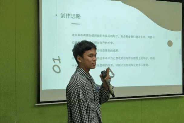 智者阅读群书,亦阅历人生。人在阅读中需要的是书籍中比知识层面更为深刻的精神层面——思考的洗礼。在主持人简洁有力却又不失条理的话语中,书籍腰封设计比赛正式拉开帷幕。首先有请到陈玉龙同学分享他的大咖阅读腰封设计——《马云:未来以来》,他的答辩明确指出:相信自己的未来一定是掌握在自己的手中。坚持不屑的努力,将会收获更多的成果。他的创作思想是以书籍主要内容为切入点,通过鲜明的色彩和字体搭配突出腰封设计主题,以图案图像的选取,呈现出开拓者、某局者、布道者等关键词,引起读者的兴趣。