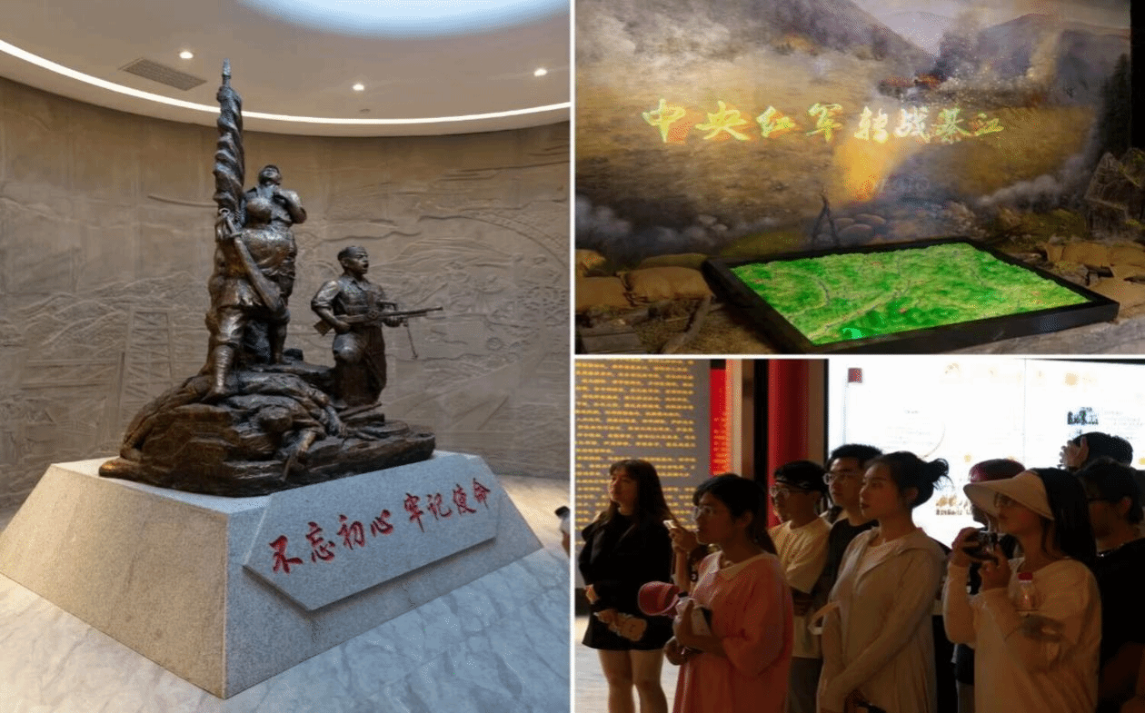 进门,头上的灯如琉璃下坠,每一根灯柱上都附着党的箴言,人民战士的雕像屹立在“不忘初心,牢记使命”的基石上”,背靠红军长征途经綦江地标浮雕。