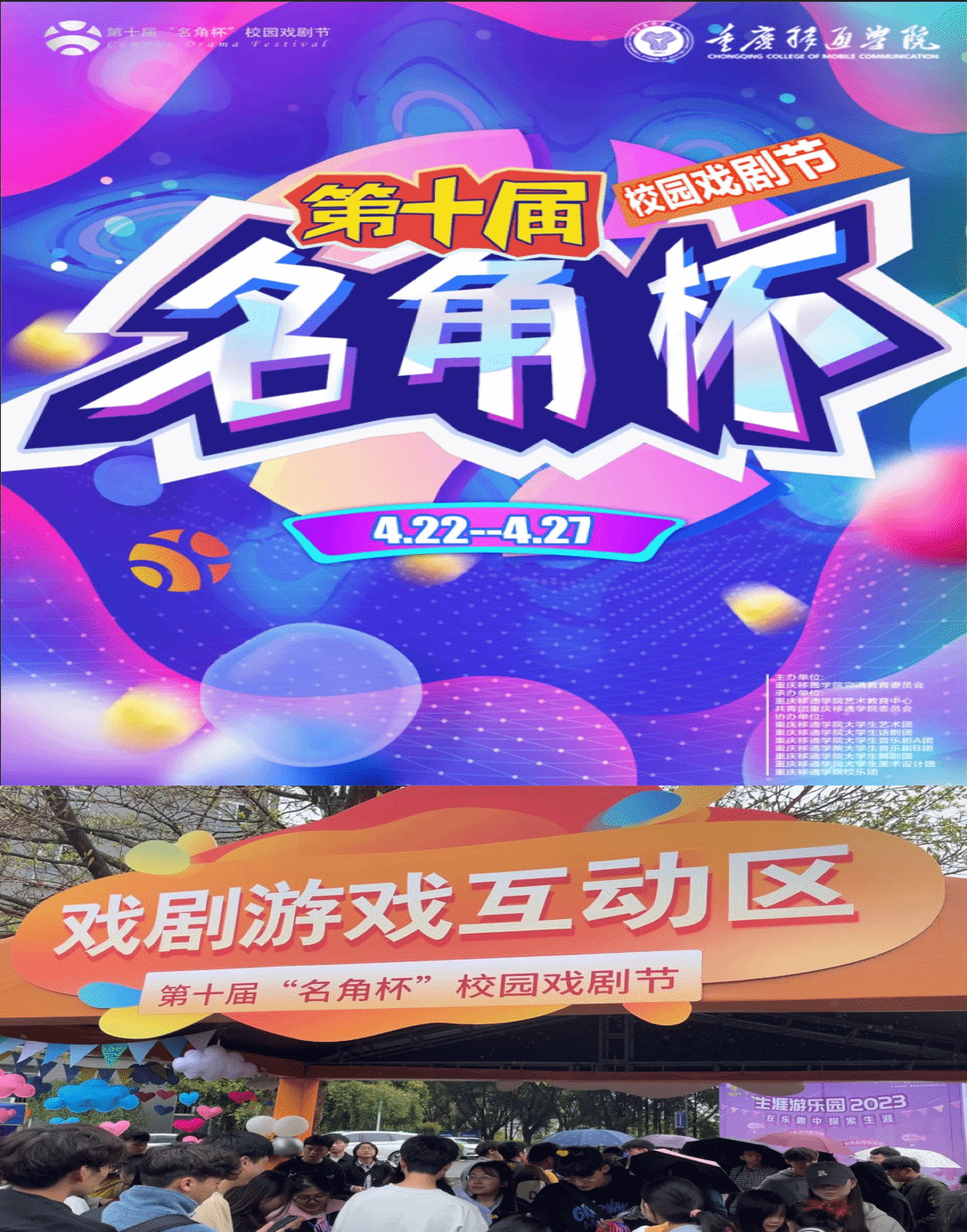近日,在学校内举办的名角杯校园戏剧节上,近距离了解戏剧中的表演技巧和态度,并有机会体验“戏剧人生”。 本次活动由学校的学生书院联合会举办,邀请校内专业老师坐镇,来校与广大学生交流互动,并为学生们提出他们的艺术经验和创作灵感。“名角们”通过讲解各自不同的戏剧形态,自由探索自己的演出风格,摒弃传统观念的束缚。同时,舞台周围搭建的外围活动引得众多台下的观众纷纷参与其中,我院以最喜欢的戏剧作品分享、猜戏剧作品等有奖竞猜活动,吸引了大量观众参与其中。
