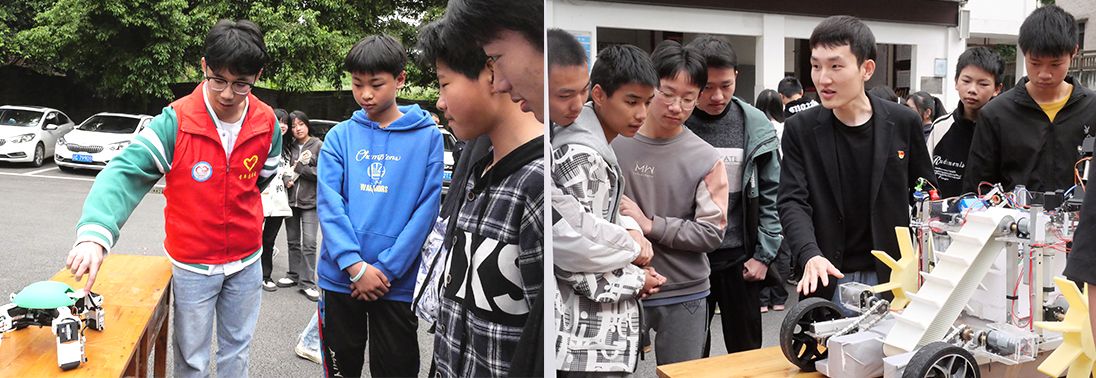智能工程学院发挥学科竞赛优势,志愿+专业相结合,将多项国赛科创作品带进校园进行了展示。隆兴中学的学生们见到这些作品时,产生了浓厚兴趣。“会跳舞的回形针”、“反应力测试机”、“合作转动的机械”、“机械伸缩花”等,充满了趣味性、互动性。“智能避障螃蟹”、“仿生天牛”、“光之翼-生态仿生瓢虫”等作品,因外表酷似生物,吸引了众多学生的目光,生物与机械的结合,也为未来的机器人发展方向增添了一抹色彩。“多足仿生舞蹈机器人”、“‘沙漠卫士’全自动智能草方格铺设车”、“水陆两栖智能垃圾处理装置”等作品,久经战场,斩获多项国家级、省部级奖项,实用型机器的研发制作,也将助力社会发展,提高效率。