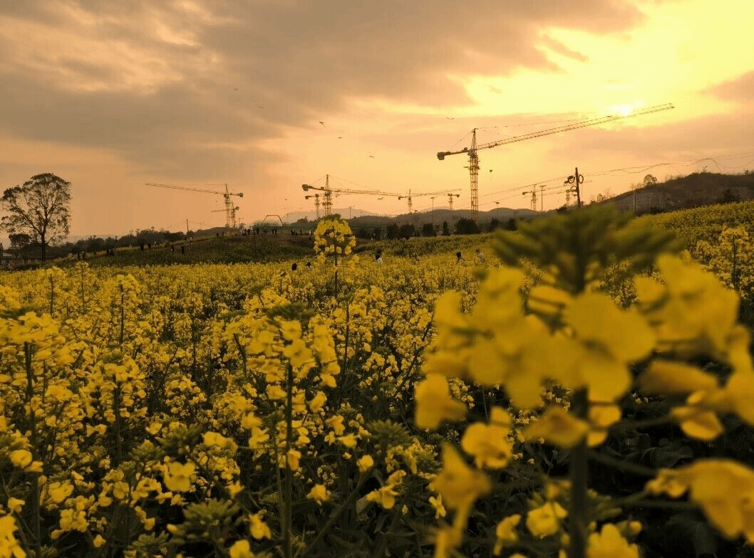 落日仿佛驱散了远处群峦上的乌云,让苍穹下的塔吊缓缓显现。金黄的油菜花在斜阳余晖的照耀下,更加英姿飒爽。画卷中任一元素都不是多余的。徜徉其间,不禁让人感慨春的梦幻灿烂,也不禁让人感叹春的绚丽短暂。