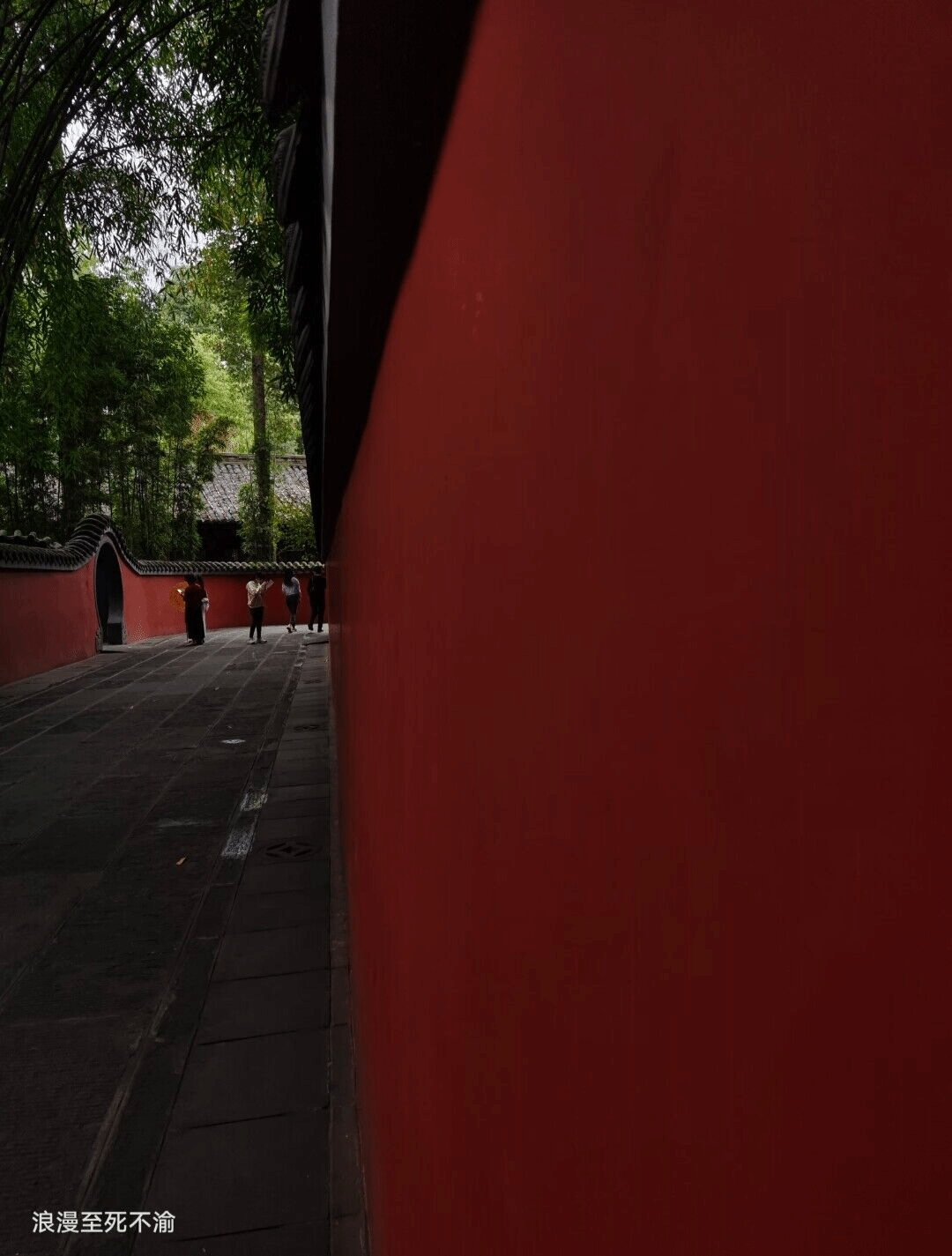 拱形门是我国传统建筑中的佼佼者,它身处茵茵竹林中。朱红的墙饰与沥黑的砖瓦、迎春摇曳的叶竹形成鲜明对比,置若其间,仿佛回到古代,让人深感华夏文明的博大精深。