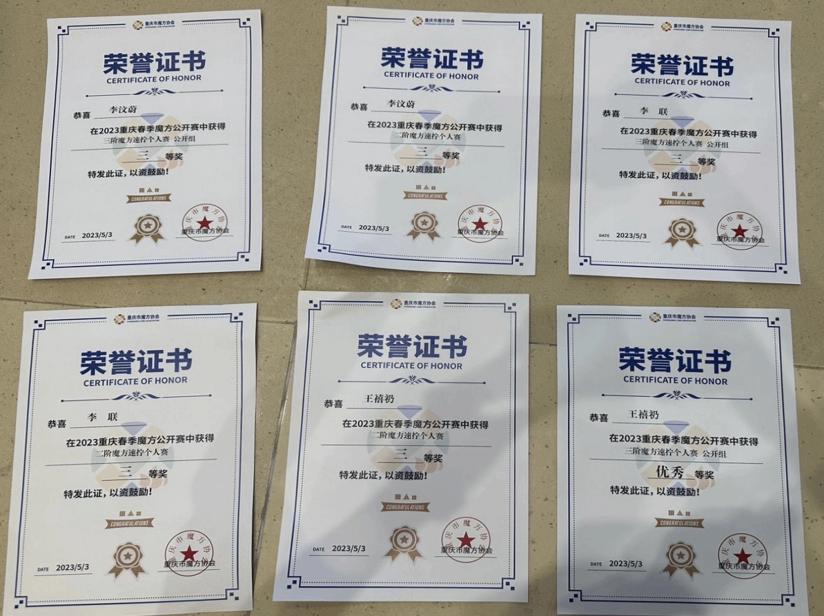 本次比赛共有170余人参赛,是重庆市规模较高的一次魔方赛事。在上午的二阶初赛中,李汶蔚同学以平均5.424s的成绩位居初赛第11名,王禧礽同学以平均5.978s的成绩位居初赛第13名,李联同学以平均6.697s位居初赛第15名,三名同学都成功进入二阶决赛!在下午的三阶初赛中,李联同学以平均13.090s的成绩位居初赛第16名,李汶蔚同学以平均13.365s的成绩位居初赛第14名,成功进入复赛,王禧礽同学以平均16.176s的成绩位居初赛第25名,荣获市级优秀奖!